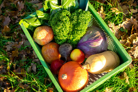 KI generiert: Gemüse und Obst in einem grünen Korb auf Gras und Laub.