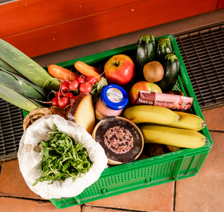 KI generiert: Eine Kiste mit frischem Obst, Gemüse, Brotaufstrich und Snacks.