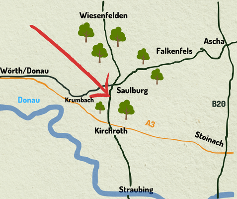 Durch den Forst Richtung Straubing. Lasse die Abfahrt Richtung Saulburg links legen, du siehst dann rechts bereits unser Firmengebäude. Vor dem Waldstück befindet sich die Einfahrt auf der rechten Seite.