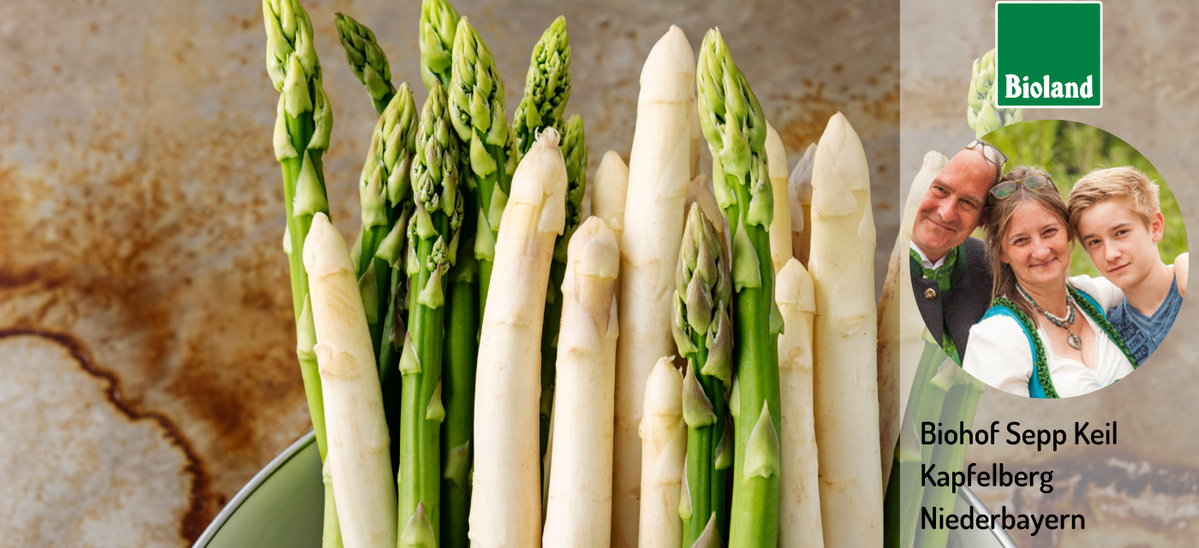 Seit vielen Jahren erhalten wir den Spargel vom Biohof Sepp Keil aus Kapflberg in der Oberpfalz. Regionaler Bio-Spargel ist arbeitsintensiv, das spiegelt sich auch im Preis wieder. Doch was ist eigentlich der Unterschied zum konventionellen Anbau? Die Reihen auf dem Bio-Spargelfeld sind weiter auseinander. Das schützt vor Pilzerkrankungen, ergibt am Ende aber natürlich auch weniger Ernteertrag als bei konventionellen Feldern. Die Keils verzichten außerdem auf mineralischen Stickstoff, was ebenfalls zu einer geringeren Ernte führt.