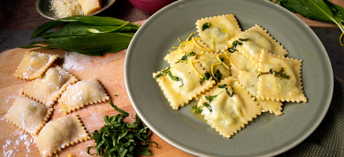 300 g Mehl, 5 Eier, 100 g Bärlauch, 100 g Parmesan, 200 g Hüttenkäse, 1 Zitrone, 100 g Butter, 2 EL Olivenöl, 2 EL Paniermehl, Salz, Pfeffer, 1 Prise Muskatnuss