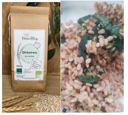 Zutaten: 1/2 Zwiebel, 50g Geräuchertes (kann auch weggelassen werden), 2 EL Rapsöl, 200g Dinkelreis, 50ml Weißwein, 450ml Brühe, 50g Emmentaler gerieben, 1 EL Butter