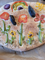 Für den Belag: Gemüse nach Wahl, z.B. 30g getrocknete Tomaten ohne Öl, 1 rote Zwiebel, 1 Frühlingszwiebel, 3 EL Olivenöl, 15g Rosmarin, 10g Petersilie, grobes Meersalz