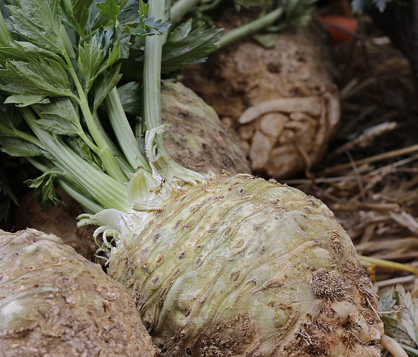 Eine echte Besonderheit und nur für kurze Zeit: Knollensellerie mit Laub! Während bei gelagertem Sellerie das Grün aus Gründen der Haltbarkeit entfernt wird, kann es bei frisch geerntetem Sellerie an der Knolle verbleiben. Zum Wegwerfen ist das Grün viel zu schade, denn daraus lässt sich ein feines Gewürzsalz herstellen