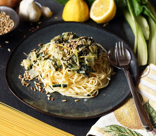 Nudelwasser mit den Brühwürfeln und Salz in einem großen Topf erhitzen. Mangold putzen und in ca. 2cm große Stücke schneiden. In das kochende Nudelwasser erst die Spagetti und dann das Gemüse geben. In eine vorge-wärmte Schüssel Olivenöl und durchgepressten Knoblauch geben. Die fertig gegarten und abgeseihten Gemüse-nudeln dazu, vermischen, bei Bedarf Öl hinzugeben. Vor dem Servieren mit geriebenem Käse würzen.