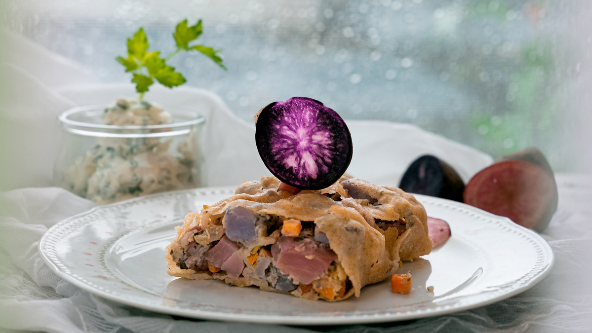 Kartoffelfüllung: 1 Zwiebel, ½ Stange Lauch, 500g Kartoffeln, 500g lila Kartoffeln, 1 Karotte, 3 EL hocherhitzbares Bratöl Olive, 1/4TL Muskat, ½ TL Majoran, ½ Bund Petersilie, 200g Schmand, 40g Butter