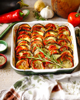 Die Tomatenmasse in einer runden oder eckigen Auflaufform verteilen. Das Gemüse