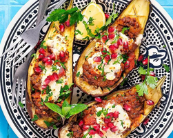 Zubereitung: Auberginen halbieren, Schnittfläche rautenförmig einschneiden. Mit 3 EL Bratöl bestreichen. In eine ofenfeste Form geben. In der Mitte des Ofens bei 220 °C Ober-/Unterhitze ca. 30–35 Minuten backen. Zwiebel und Knoblauch fein hacken. In 2 EL heißem Bratöl in einer Pfanne 2–3 Minuten braten. Tomatenmark zugeben, kurz mitrösten. Tomaten, Linsen, Paprikapulver, Ras el Hanout und Oregano zugeben. 10 Minuten leicht köcheln lassen. 2/3 des Fruchtfleisches aus den Auberginen lösen, kleinschneiden und mit der Tomatenmasse mischen. Mit Zucker, Salz und Pfeffer abschmecken und in die Auberginen füllen. Feta zerbröseln, mit Milch cremig rühren und auf den Auberginen verteilen. In der Mitte des Ofens bei 220 °C Ober-/Unterhitze ca. 10–15 Min. backen. Mit gehackter Petersilie, etwas Zitronensaft und Granatapfelkernen servieren.