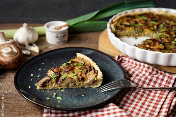 Für den Mürbeteig Mehl und Salz in einer Schüssel vermischen. Die kalte vegane Butter in Stücke schneiden und mit 5 EL kaltem Wasser hinzugeben. Alles mit den Händen zu einem Teig kneten. Zu einer flachen Kugel formen und zugedeckt 30 Minuten in den Kühlschrank legen. Für die Füllung den Lauch waschen, putzen und in Ringe schneiden. Etwas von dem grünen Teil des Lauchs für das Topping zur Seite legen. Die Champignons in Scheiben schneiden, 100 g für das Topping zur Seite legen. 3 Knoblauchzehen fein hacken, ein Drittel davon ebenfalls zur Seite legen. Den Ofen auf 200°C vorheizen. 50 g vegane Butter in einer Pfanne erhitzen. Lauch und Champignons hinzugeben und ca. 5 Minuten anbraten. Knoblauch und Thymian hinzugeben und ca. 2-3 Minuten weiterbraten. Mit Salz, Pfeffer und Gemüsebrühpulver würzen. Den Teig auf einer bemehlten Arbeitsfläche ca. 5 mm dick ausrollen. In eine leicht gefettete Quiche-Form legen, Ränder hochziehen und gut festdrücken. Den Boden einige Male mit einer Gabel einstechen. Den Seidentofu mit der Maisstärke cremig mixen. Unter die Champignon-Lauch-Mischung rühren. Bei Bedarf nochmal abschmecken. Die Füllung auf den vorgebackenen Mürbeteig geben und glatt streichen. In einer Pfanne die restliche vegane Butter erhitzen, die zurückgelegten Champignonscheiben, übrigen Knoblauch anbräunen und auf der Quiche verteilen. Die Quiche ca. 30 Minuten backen, anschließend ca. 10 Minuten abkühlen lassen. Mit den zurückgelegten Lauch-Ringen bestreuen und warm oder kalt servieren.