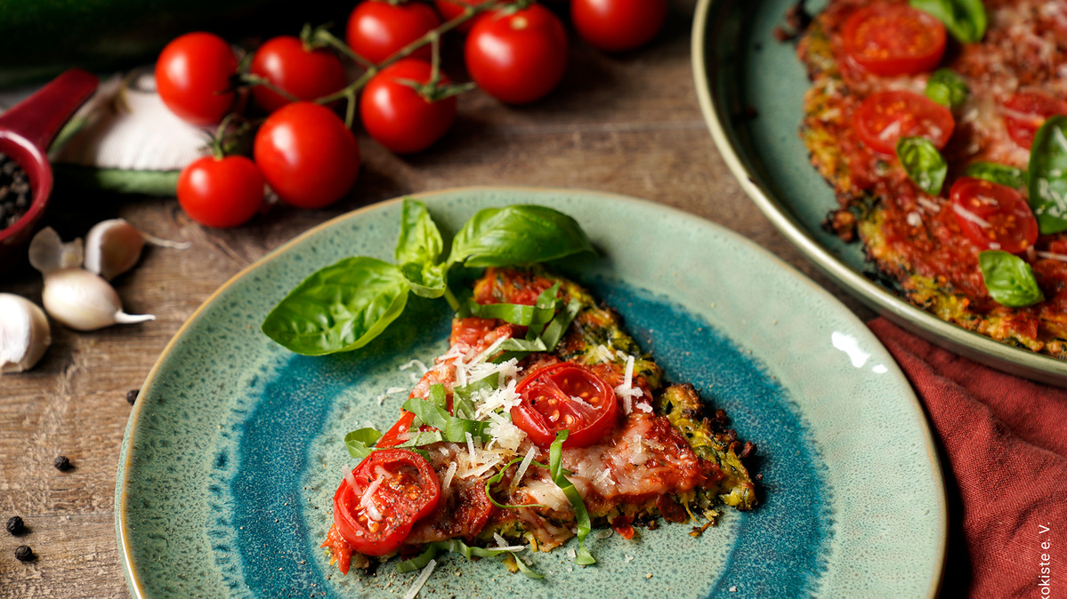 Ofen auf 200°C vorheizen. Enden der Zucchini abschneiden. Zucchini fein raspeln, in einer Schüssel mit 1 TL Salz gut vermengen und 15 Minuten stehen lassen. Danach in ein Küchentuch geben und sehr gut auspressen. Die Masse sollte nach dem Auspressen richtig trocken sein. Das Ei verquirlen, 50 g Parmesan reiben und mit den Haferflocken und etwas Pfeffer unter die Zucchini-Masse rühren. In der Zwischenzeit für die Tomatensauce Zwiebel und Knoblauch fein hacken, 230 g Tomaten halbieren. In einem Topf das Olivenöl erhitzen, die Zwiebel darin anbräunen, den Knoblauch kurz mitbraten und mit dem Tomatenmark, Zucker, einigen kleingeschnittenen Basilikumblättern und Oregano verrühren. Nun die halbierten Tomaten dazu geben und 25 Minuten bei kleiner Hitze köcheln lassen. Ab und zu rühren. Pürieren und mit Salz und Pfeffer abschmecken. Die Zucchini-Masse auf ein Blech mit Backpapier geben und zu einem Kreis mit etwa 20 cm Durchmesser platt drücken. 10 Minuten goldbraun backen. Wenden, mit der Tomatensauce bestreichen und den übrigen, in dünne Scheiben geschnittenen Tomaten belegen und dem restlichen, geriebenen Parmesan bestreuen. Weitere 8-10 Minuten backen, bis der Käse zerlaufen ist. Mit abgezupften Basilikumblättern dekorieren und servieren.