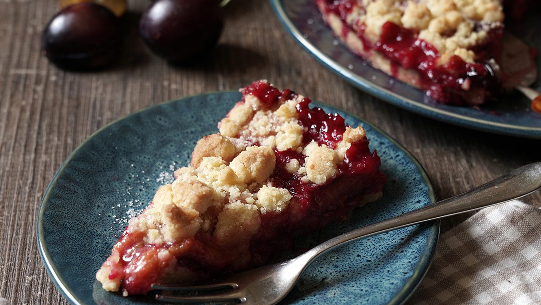Ofen auf 180 °C vorheizen, Boden und Rand einer Springform mit etwas Butter einfetten. Für den Belag die Zwetschgen waschen, aufschneiden, entkernen und je nach Größe halbieren oder vierteln. Butter in einer Pfanne oder einem Topf bei mittlerer Hitze schmelzen lassen, Zwetschgen hinzugeben. Mit Rohrohrzucker und Vanillezucker bestreuen und vermengen, Zucker unter Rühren auflösen lassen. Stärke mit einem Sieb darüber stäuben, vorsichtig verrühren und auf kleiner Stufe 2 Minuten leicht köcheln lassen. Umrühren, von der Platte nehmen, etwas abkühlen lassen. In der Zwischenzeit für den Boden und die Streusel das Mehl, kalte Butter in Flöckchen und Zucker mit Knethaken oder Rührbesen vermengen, bis eine feinkrümelige Masse entsteht. 2/3 der Masse in der Springform verteilen und mit einem Esslöffel gleichmäßig fest drücken, Zwetschgenmasse darauf gleichmäßig verteilen. Mit den Händen aus der restlichen Teigmasse Streusel reiben und diese auf dem Belag verteilen. Im Ofen auf der mittleren Schiene 40-45 Minuten backen. Der Kuchen kann warm oder kalt gegessen werden.