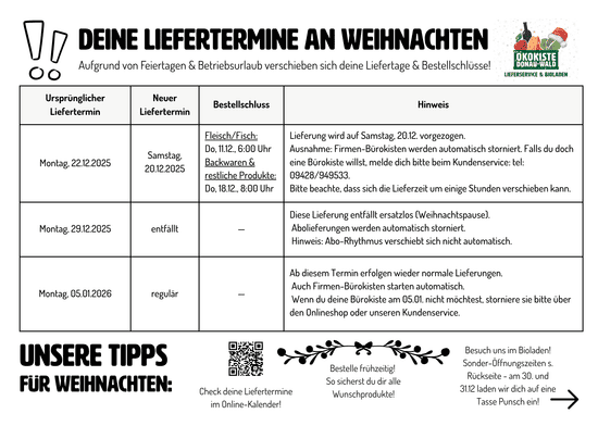 Vom 25.12. bis 04.01. machen wir eine kleine Pause, deshalb entfällt der Liefertermin vom Mo, 29.12. Abokisten und Daueraufträge werden automatisch storniert. Besuch uns zwischen den Jahren im Bioladen: am 30. und 31.12. laden wir dich auf eine Tasse Punsch ein!