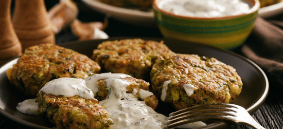 Zutaten: 1 Stange Lauch, 200 g Knollensellerie, 1 Karotte, 2 EL Mehl, 2 EL Haferflocken, 1 Ei (oder 2 EL Apfelmus als vegane Alternative), Salz, Pfeffer, Muskat, Öl zum Braten, 150 g Joghurt (oder vegane Alternative), 1 TL Zitronensaft, Frische Kräuter oder etwas Rucola