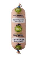 Zutaten: Schweinefleisch*, Speck*, Schweineleber*, Zwiebelpulver*, Apfel*, Steinsalz, Zwiebel*, Speisesalz, Trockenpilze*, Cranberry*, Apfelsaftkonzentrat*, Pfeffer*, Koriander*, Curcuma*,