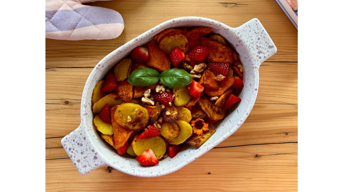 Rezept-Tipp von Ernährungsberaterin Julia Hien: Ungewöhnliche Kombi, aber eigentlich ziemlich perfekt! Die Kartoffeln versorgen dich mit komplexen Kohlenhydraten und sättigenden, wasserlöslichen Ballaststoffen, die die Verdauung unterstützen. Die Erdbeeren liefern ebenso Ballaststoffe, Vitamin C und wertvolle Antioxidantien für dein Immunsystem. Gemeinsam stärken sie deine Darmgesundheit und halten deinen Blutzuckerspiegel stabil.