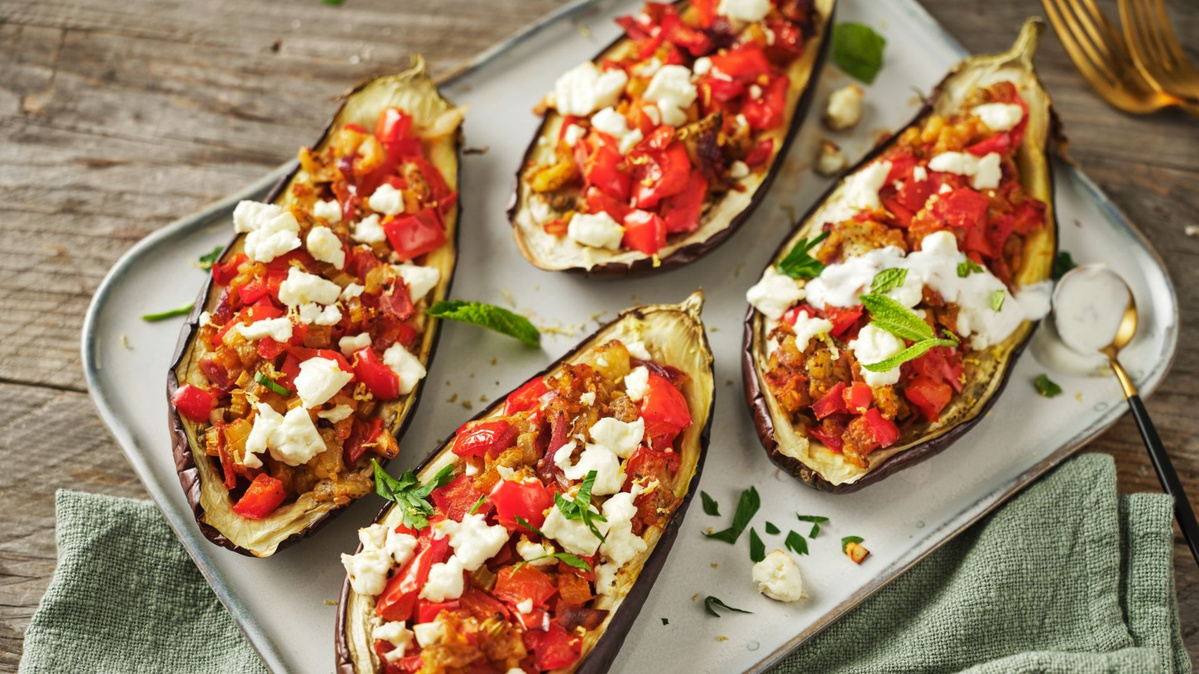 Auberginen aus dem Ofen nehmen und das Innere mit einem Löffel heraus schaben. Das Fruchtfleisch mit zum Pfannengemüse geben und unterrühren. Auberginen mit dem Gemüse füllen und für weitere 25 Minuten in den Ofen schieben. 10 Minuten vor Ende der Garzeit Fetakäse über die Auberginen bröseln.