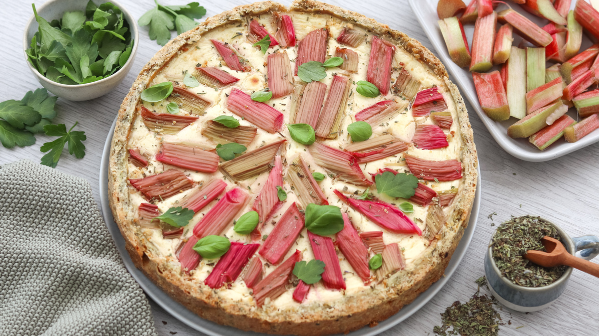 Währenddessen Frischkäse, Quark, Parmesan, Zitronenschale, Eier und Salz in eine Schüssel geben und verrühren. Die Füllung auf den vorgebackenen Teig geben, glatt streichen und für 30 Minuten auf der untersten Schiene backen. Rhabarber abtropfen lassen und mit einem Küchentuch leicht trocken tupfen.Den Kuchen aus dem Ofen nehmen und nach Belieben mit Rhabarber belegen. Weitere 10 Minuten auf der obersten Schiene backen. Auf einem Gitter 10 Minuten abkühlen lassen. Lauwarm mit frischem Basilikum bestreut servieren.