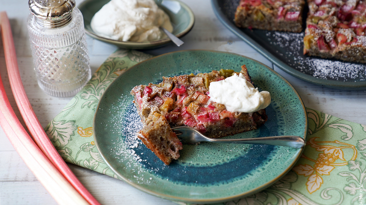 Die Masse in der Form verteilen und glatt streichen. Nun die Rhabarberstücke gleichmäßig darauf verteilen und etwas eindrücken.