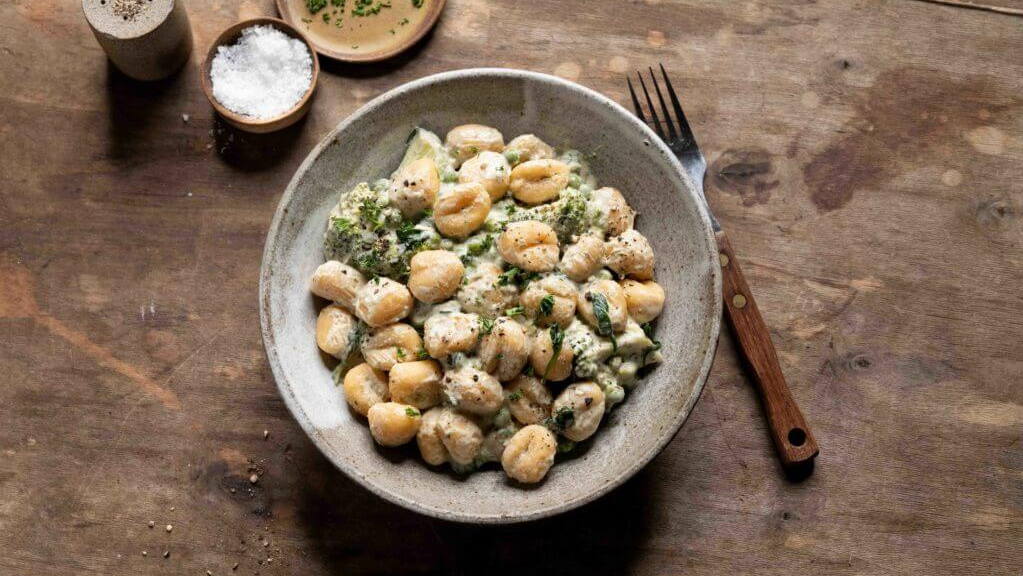 Süßkartoffel-Gnocchi mit cremigem Pesto und Gemüse