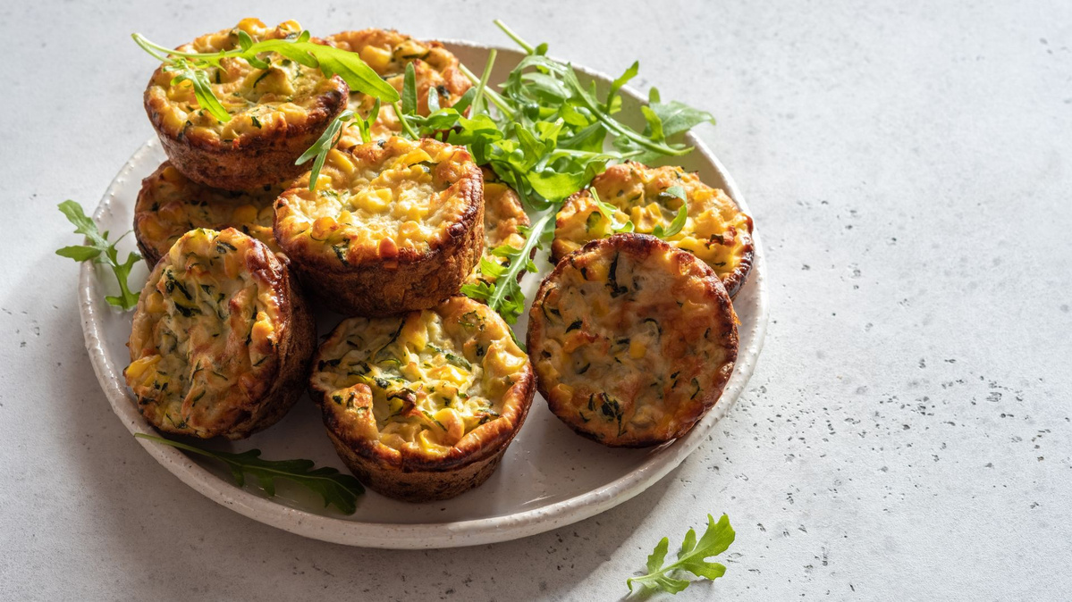 Nun die Ei-Joghurt-Mischung darüber gießen und alles verrühren. Die Mulden einer Muffinform fetten und die Masse einfüllen. Mit den übrigen Feta Würfeln bestreuen und etwa 25 Minuten im Ofen backen. Nach dem Backen noch etwas in der Form stehen lassen und dann herausnehmen, mit etwas Petersilie dekorieren.