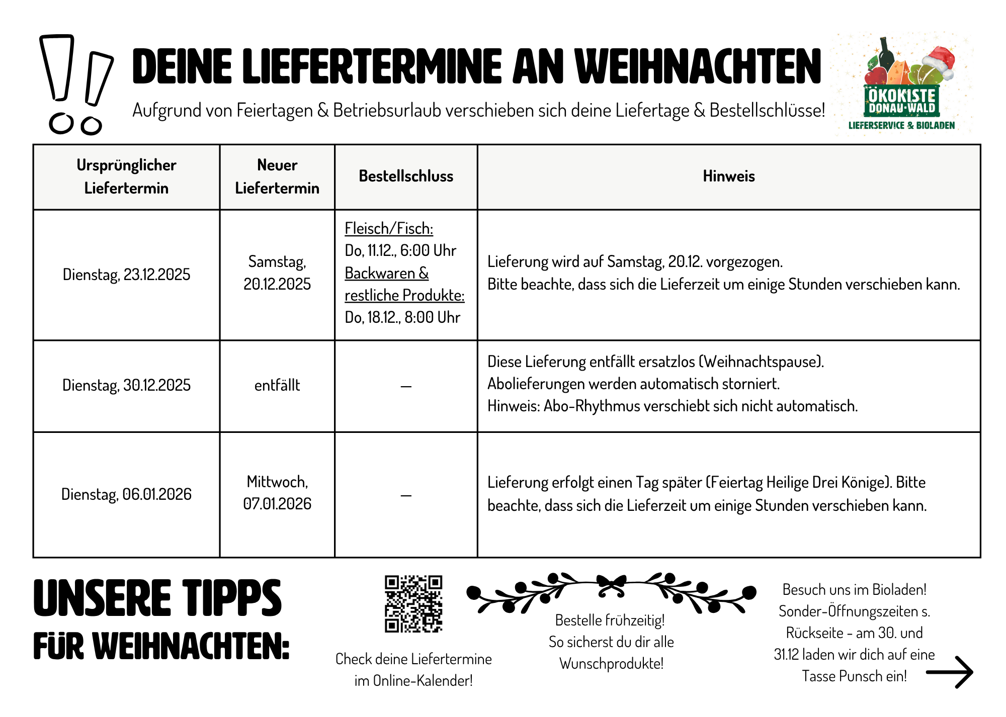 Du erhältst deine Ökokiste normalerweise am Dienstag? Dann findest du hier die Übersicht der Liefertermine rund um Weihnachten und Neujahr! Durch Klick auf das Bild kannst du die Übersicht auch bequem ausdrucken oder dir einen Screenshot machen!