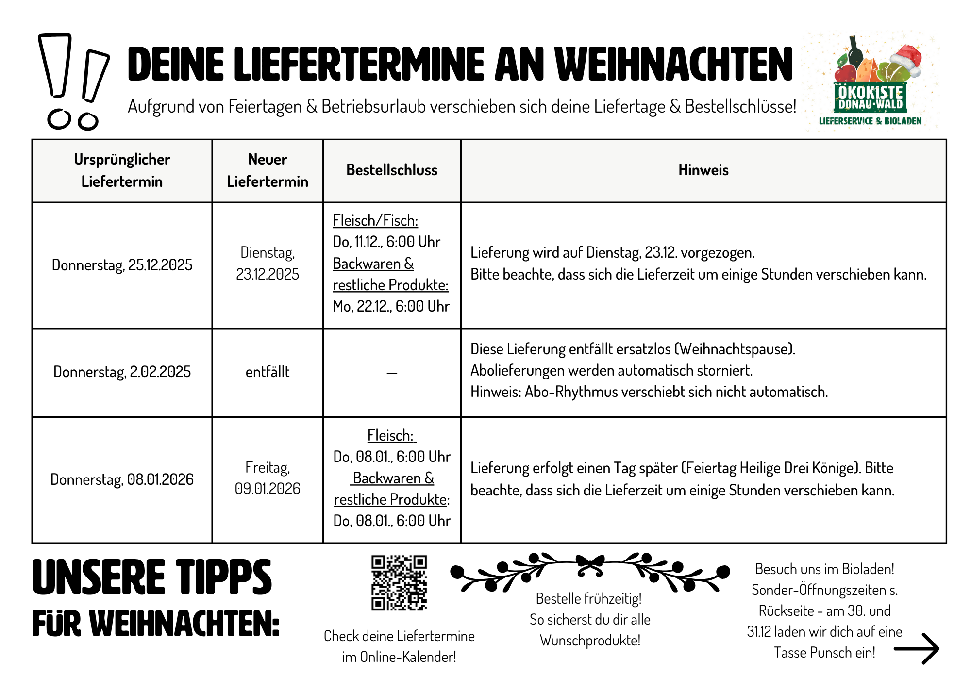 Du erhältst deine Ökokiste normalerweise am Donnerstag? Dann findest du hier die Übersicht der Liefertermine rund um Weihnachten und Neujahr! Durch Klick auf das Bild kannst du die Übersicht auch bequem ausdrucken oder dir einen Screenshot machen!